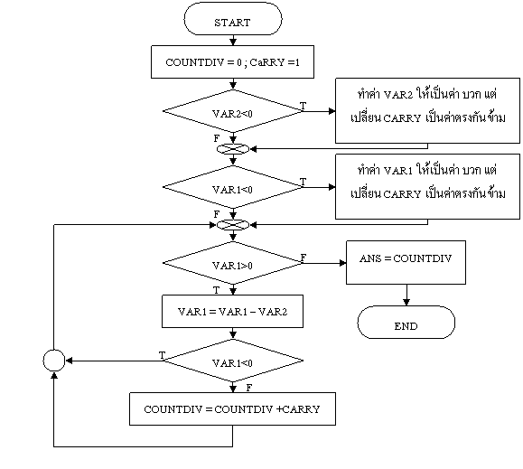 VAR1 อีกครั้ง ว่าน้อยกว่า 0 หรือไม่ ถ้าไม่ ให้ เพิ่มค่า COUNTDIV(-1) จากค่า CARRY โดย CARRY เป็น -1(FFFF) จะทำให้